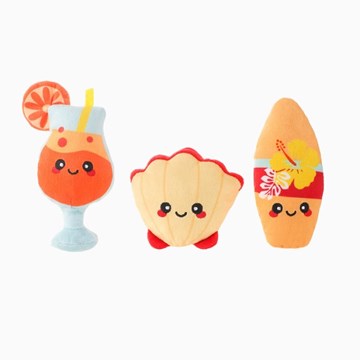Bring on the coastal fun with this 3-pack Beach Dog Toy Set. This set includes a cocktail toy, sea shell toy, and surfboard toy, all designed for endless playtime fun. Each toy features a loud squeaker and soft plush materials, perfect for small dogs that love to play all day.